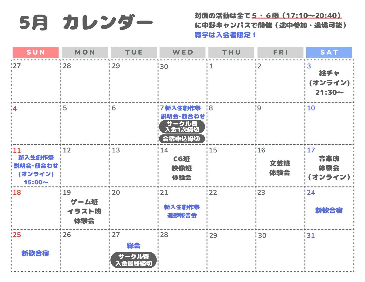 - 5月7日(水):新入生創作祭説明会・顔合わせ、サークル費入金1次締め切り、新歓合宿申し込み締め切り